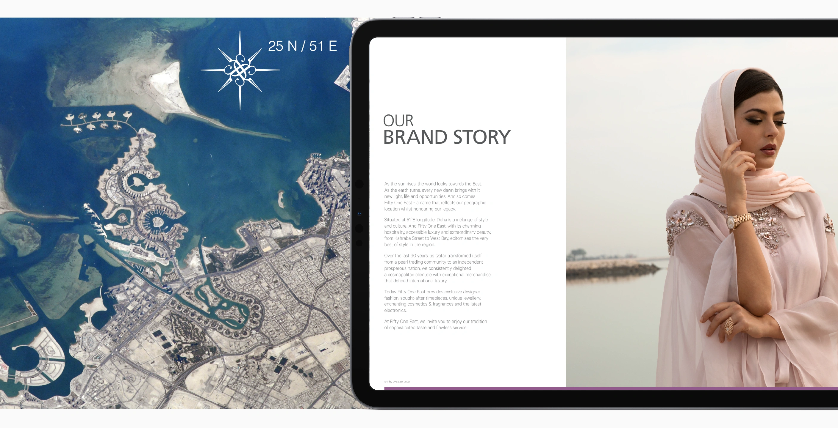 Completely unique to Qatar is its geographic coordinates 51 degrees East. This was the big idea and the inspiration for recommending Fifty One East as the new brand name. In 2008 the retail brand reinvigorated itself to Fifty One East, as a fitting tribute to the location and people of Qatar.