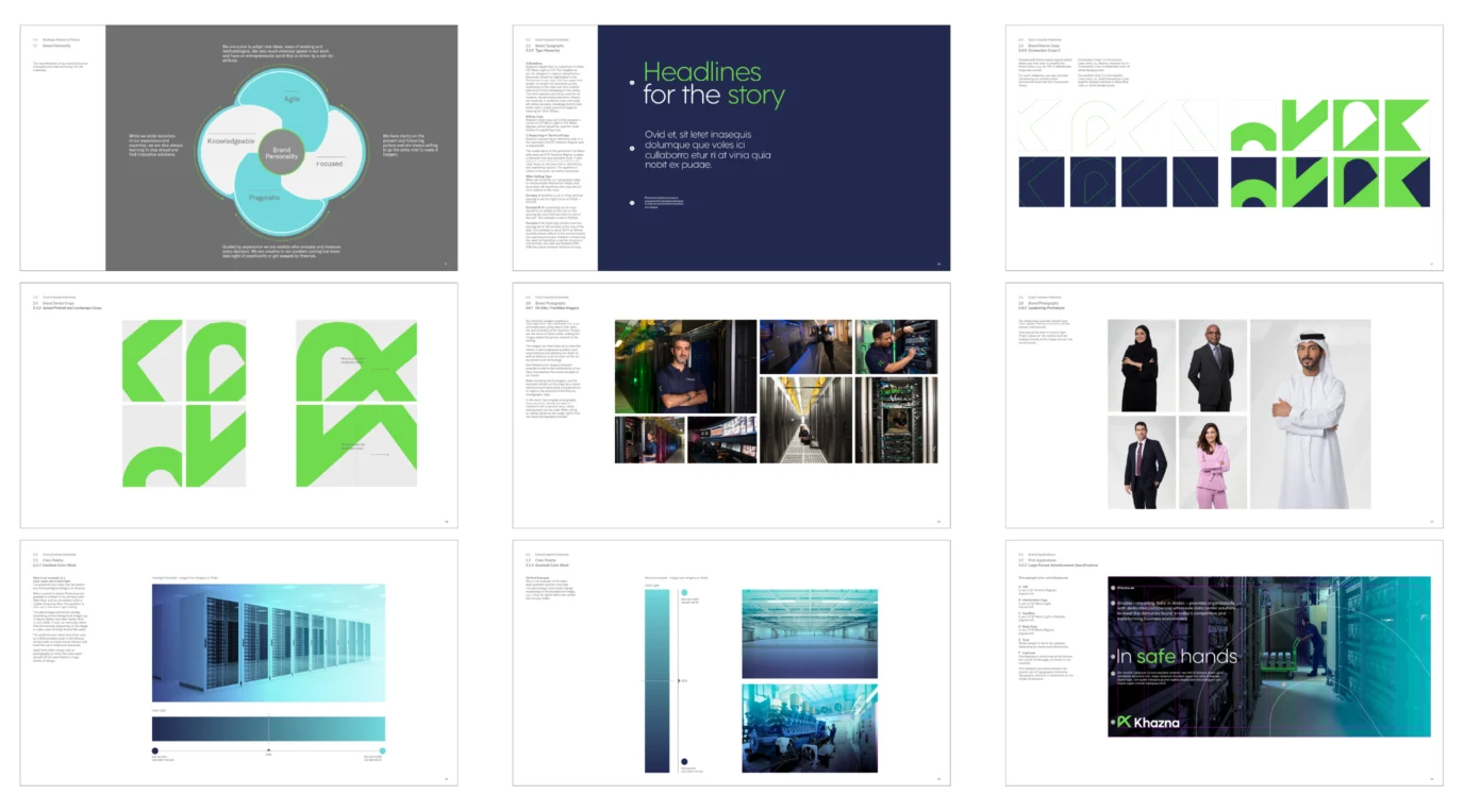 Taking the brand essence in a visual space we designed an identity system that reflected how data connects us to businesses, to our personal needs and to each other. Crafted with an underlying geometry, the brand mark is a fresh expression of data’s fluidity and connection. Accompanying the brand mark is a distinguishable brand asset suite of brand colours, visual language and crops, typography, grids, and art directed and shot photography; proprietary tools that enable Khazna to create unique, ownable, and distinctive brand collateral, campaigns, and advertisements today, and in the future.